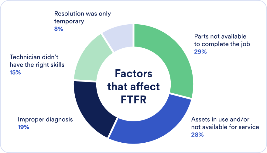 Your first time fix rate (FTFR) can be affected by several factors, including parts unavailability, assets not being available for service, improper diagnosis, and technicians not having the right skills.